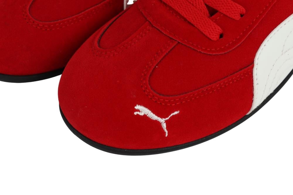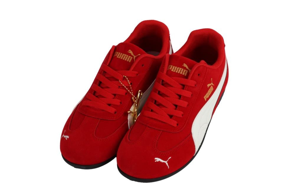 تصميم لافتيأتي الحذاء باللون الأحمر الزاهي المميز مع شعار PUMA الجانبي باللون الذهبي الأنيق، إلى جانب الخط الأبيض الجانبي الذي يمنحه توازناً بصرياً يعكس هوية العلامة. كما يتدلى من الحذاء إكسسوار معدني بشكل شعار بوما الذهبي لإضافة لمسة من الفخامة غير المألوفة في الأحذية الرياضية.